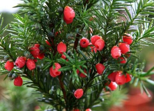 紅豆杉的種子包裹在鮮紅的果實(shí)中。果實(shí)成熟后非常鮮艷,看起來(lái)很吸引人。11月左右,果實(shí)完全成熟后,采摘,從果實(shí)中取出種子,晾干保存。