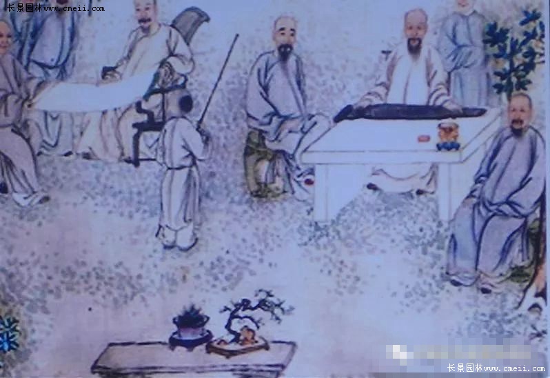 6.王維為什么要在盆中放一塊對(duì)蘭蕙的生長盛衰沒有任何關(guān)系的石頭呢?更值得人們深思的是馮摯在記述文字中沒有使用“置”、“放”、“擺”、“擱”等常用字,而選用了一個(gè)讓人頗感意外的“養(yǎng)”字。有人不禁要問:本無生命特征的石頭怎么能“養(yǎng)”呢?唯一的答案只能是,身為唐代大詩人、大畫家、大音樂家的王維,在將自己的繪畫經(jīng)驗(yàn)和“詩言志”、“詩緣情而發(fā)”的詩歌創(chuàng)作理念以及音樂的節(jié)奏、節(jié)拍、旋律、和聲、曲式等藝術(shù)特性和理論等借鑒于盆景創(chuàng)作以后,作為盆景的基本表現(xiàn)元素、本無生命的石頭,就產(chǎn)生了一種奇妙的蛻變。于是,在王維眼中,這塊本無生命的綺石,驟然間華麗轉(zhuǎn)身為一塊擬人化的有生命的“活石”了。而把這樣一塊“活石”“養(yǎng)”起來,也就變得合情合理了。這塊綺石不僅對(duì)盆景營構(gòu)畫面起到了烘托、渲染的作用,更重要的是它滿足了創(chuàng)作者對(duì)心理情感、意志品質(zhì)、社會(huì)人生乃至宇宙精神的訴求。可以毫不夸張地說,王維的盆景“養(yǎng)以綺石”,是中國盆景史上一項(xiàng)前無古人、無與倫比的偉大創(chuàng)舉。中國盆景從此有了各種配件的廣泛應(yīng)用,有了藝術(shù)意境的創(chuàng)作追求,有了詩情畫意的審美境界。更為重要的是王維的這一創(chuàng)舉,對(duì)確立中國盆景的藝術(shù)地位,起到了至關(guān)重要的催化、支撐和穩(wěn)固的作用。王維的“養(yǎng)以綺石”還歷史性地開創(chuàng)和規(guī)范了中國盆景的基本表現(xiàn)模式,即石與植物的組合。王維的這種盆景模式,受到后世文人特別是文化精英們的熱切關(guān)注和大力推崇。如施耐庵就曾在其名著《水滸傳》(第81回)中專門寫過宋代的松石盆景:浪子燕青拜訪京師名妓李師師,“入到客位前,見周回吊掛名賢書畫。階檐下放著三二十盆怪石蒼松?!倍嫾依钍啃械摹顿人蓤D》以及清葉芳林、方士庻的《九日行庵文燕圖》(圖4)等,畫的都是樹與石結(jié)合的盆景。再看看當(dāng)代中國盆景,其表現(xiàn)形式豐富多彩,而樹與石組合的盆景更是琳瑯滿目。不管是以樹為主兼以體量很小的單體點(diǎn)綴石組成的盆景,還是以石頭為主兼以樹木為輔的山水盆景、樹附石(圖5)盆景,抑或是石、樹所占比例相差不大甚至幾乎均分的水旱盆景、樹石盆景(圖6)等等,無不是王維盆景制作理念、方法、模式的延續(xù)和拓展。已故著名中國盆景藝術(shù)大師賀淦蓀先生提出的“樹石盆景”概念及其高足、中國盆景藝術(shù)大師張志剛君所著《中國樹石盆景》一書的文化源頭和理論根據(jù),就在這里。
