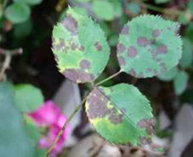 該病為害月季、薔薇、黃刺玫、玫瑰、白玉堂等近百種薔薇屬植物及其雜交種。主要為害葉片,感病初期葉片上出現(xiàn)褐色小點,以后逐漸擴大,邊緣呈不規(guī)則的放射狀,病部周圍組織變黃,病斑上生有黑色小點,即病菌的分生孢子盤,嚴(yán)重時病斑連片,甚至整株葉片全部脫落,成為光桿。嫩枝上的病斑為長橢圓形、暗紫紅色、稍下陷。